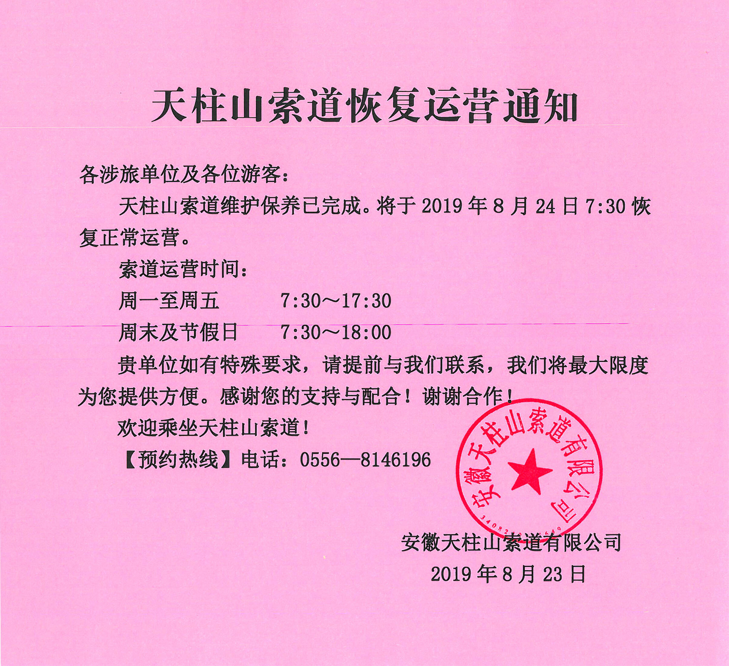 關(guān)于天柱山索道恢復(fù)運(yùn)營(yíng)的通知