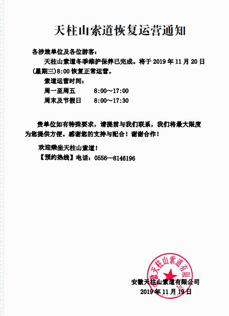天柱山索道恢復(fù)運(yùn)營(yíng)通知