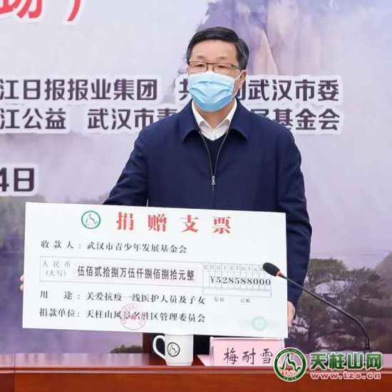 中共潛山市委書記張勁松出席捐贈儀式并致辭,市委副書記、市人民政府市長、天柱山管委會主任梅耐雪代表天柱山管委會向長江日報長江公益、武漢市青少年發(fā)展基金會捐贈資金5285880元,市委常委、天柱山管委會副主任涂高生,市人民政府副市長蔡婷婷出席儀式。長江日報報業(yè)集團負責(zé)人出席儀式并講話,共青團武漢市委負責(zé)人向天柱山管委會頒發(fā)榮譽證書,天柱山風(fēng)景區(qū)、長江日報長江公益、武漢市青少年發(fā)展基金會三方代表簽訂《天使的孩子—關(guān)愛武漢抗疫醫(yī)護人員及子女·天柱山基金》協(xié)議書。