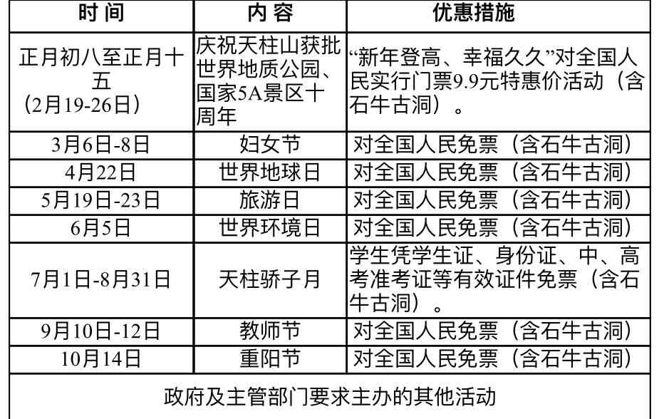 2、高鐵團、飛機團人數(shù)達到20人以上,憑地接社出具團隊確認書和高鐵票原件或機票原件,門票按全價票訂票,結算按40元/人,且包含石牛古洞。