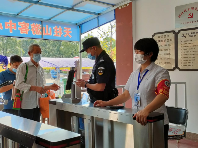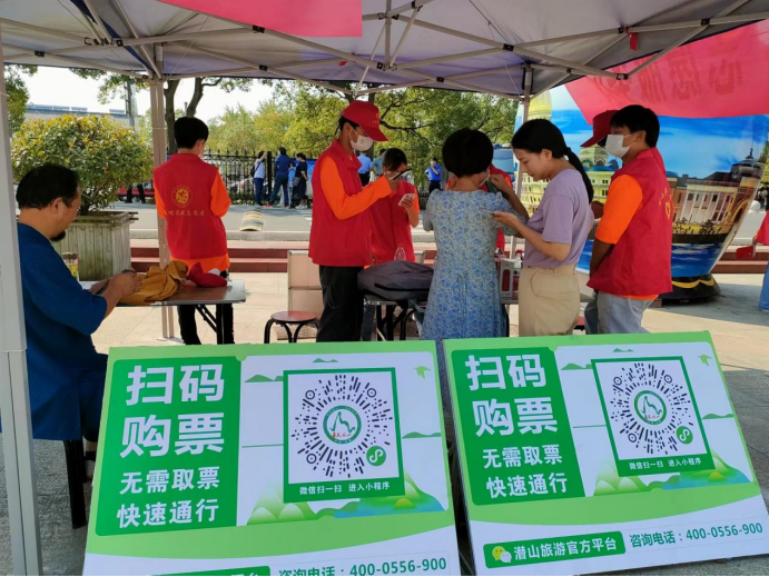 秋日明媚,天空湛藍(lán),天柱山景區(qū)彩旗飄飄,游客絡(luò)繹不絕,歡聲笑語中更顯節(jié)日濃厚的喜慶氛圍?!白鹁吹挠慰?#xff0c;請佩戴好口罩,保持一米間距”“請到這邊來掃安康碼”身穿紅馬甲,頭戴小紅帽的天柱山旅游志愿者的語音在游客中心廣場上此起彼伏。