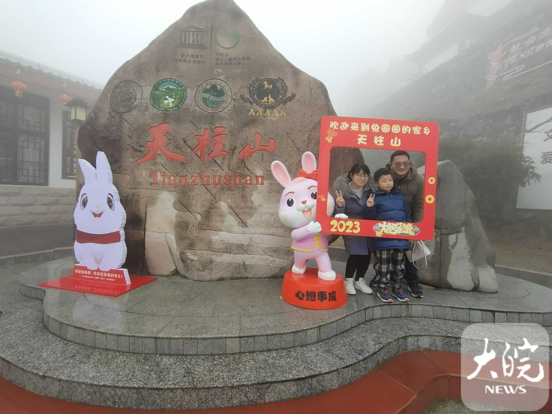 春節(jié)假期,天柱山風(fēng)景美,年味濃,景區(qū)在馬祖、茶莊游客中心、天池峰等多處設(shè)有歡慶新年的“兔圓圓”卡通形象,游客在這里拍照,許下美好愿望?!敖衲甏汗?jié)帶著家人在天柱山旅游過(guò)年,提前在網(wǎng)上預(yù)訂好民宿,一家人開(kāi)心快樂(lè)地體驗(yàn)山岳風(fēng)情,吃農(nóng)家菜、看民俗、滑冰雪、賞美景,體驗(yàn)“慢生活”,在“兔圓圓”故鄉(xiāng)過(guò)兔年,意義非凡?!眮?lái)自上海的余先生開(kāi)心地說(shuō)。